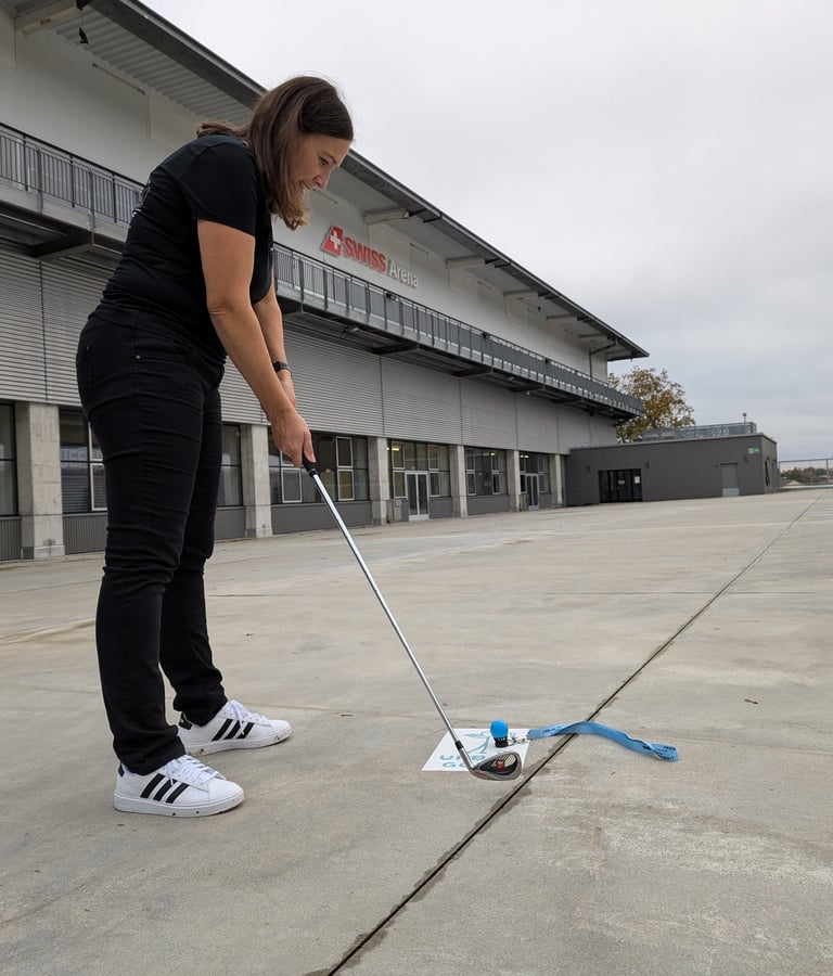 Abschlag: Immer vom Bäseli, gesichert mit Schnur und Lanyard.